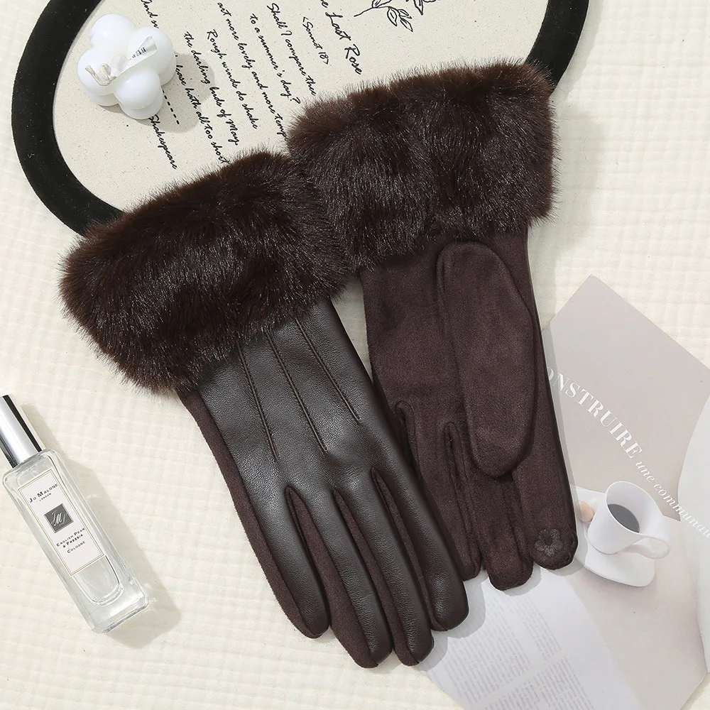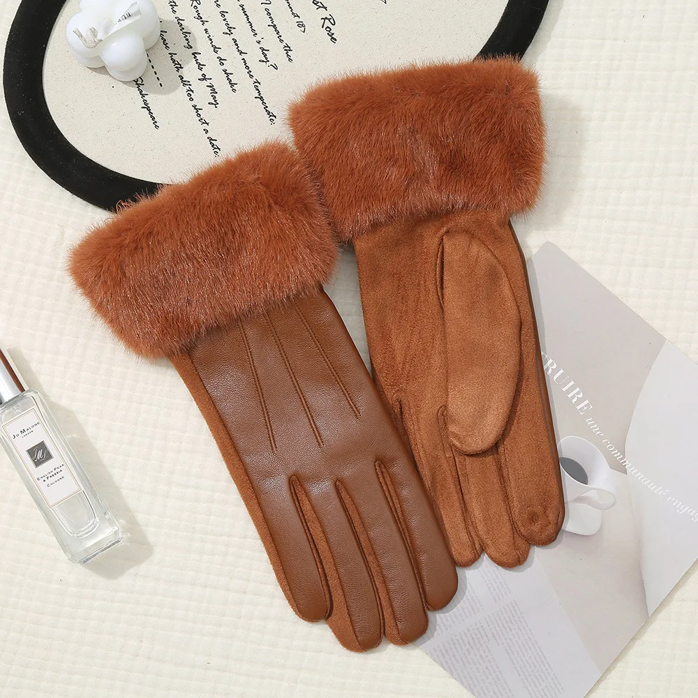 New Leather Fashionable Soft Gloves for Women Artificial Fur Cuffs Winter Warm Touch Screen Gloves Elegant Waterproof Gloves